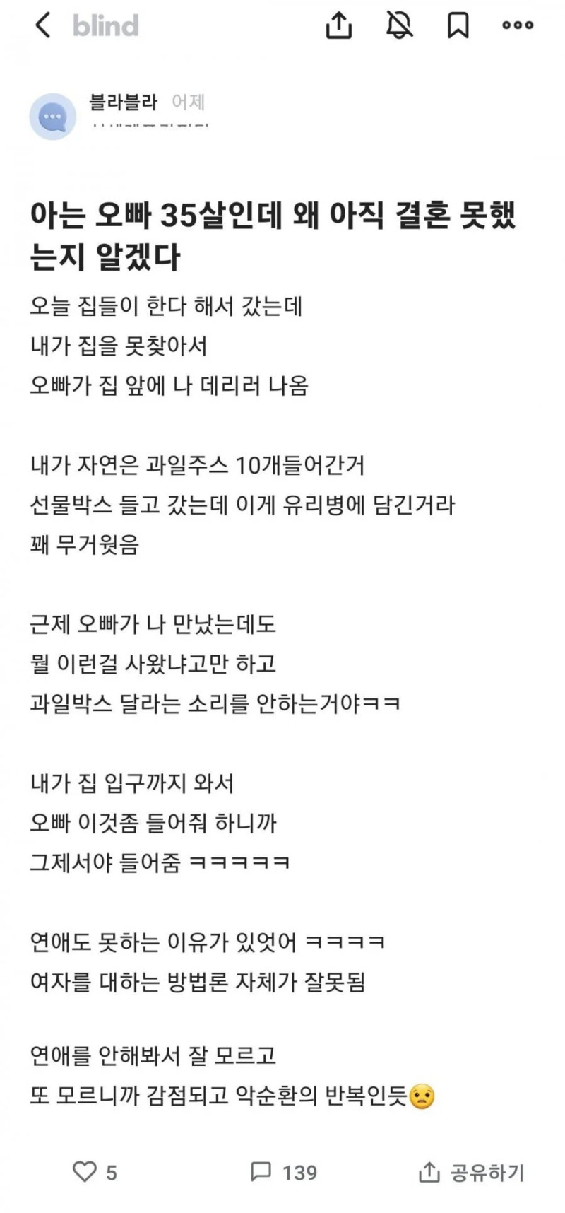 블라에서 난리난 아는 오빠 35살인데 결혼 못한 이유