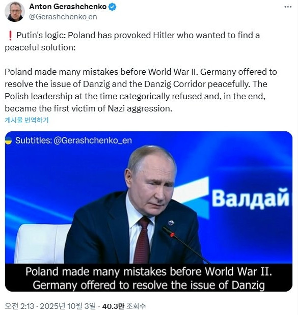 푸틴은 심지어 2019년 국방부 회의에선 폴란드가 히틀러와 공모해 같이 소련을 침공한 거라는